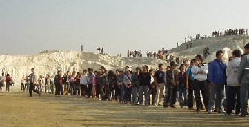 塩山というのは、もともと塩田の近くの塩の保管所のような所だったようです。そ れが、塩田が使われな くなって、観光地にしてしまったラシイ。観光化するにあたっては、海外からわざわざ岩塩を輸入したとか。とにかく、塩でできた白い小高い丘がそびえている というところです。子供用遊園地とか、死海みたいに浮く事のできる塩水プールなんてのも併設です。周りは養魚場ばかりでなんにもないところですが、塩山ま で行くと大型観光バスが何台も乗りつけてて、立派な駐車場もあるし、みやげ物や食べ物の屋台も連なっていて、ほんとにものすごい賑わいようでした。 「なんでこんなのが(おっと失礼)こんなに人気なんだろう??」不思議です。 コンサートは入場料が100元と安かったためか、ものすごい盛況でした。きっと 観光でやってきたヒト も見に来てたんでしょうね。海風をさえぎるものがないので、夜になるとかなり寒かったです。6時ごろから12時近くまで、コンサートを見ました。 |