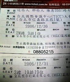 掲示板に書いた感想から・・・ 「今回6時間近くのなが 〜いコンサートでした。怪我した後のはじめ ての正式のコンサートで、いつになく真剣に歌っていました。満席の観客もとてもいい反応、聞くところは聞き、湧くところは湧き。前にも書きましたが、陳昇 のこの跨年コンサートは、同じ日に各地でオールスター総出演の無料コンサートが行われる中、たった一つの有料コンサートなので、それなりの観客が集まって るんだろうと思います。 コンサートのオープニン グは、まずバンドメンバーを一人ずつ入場さ せ、紹介して行くと言う趣向。ベースの家駒、ギターの振栄、楊老師、ドラムの阿文、ピアノのBigJoe、バイオリンの李佳龍と新旧入り混じりのバンドマ ンたちとアンプラグドで「恨情歌」からはじまる、ヒット曲メドレー。みんなネクタイなしのスーツを着ていて、シックな雰囲気。 2段目は、陳昇の育てた (有る新聞には「栽培した」とかいてありま した)二人組「笛雁」と「霈文」からなる「小護士」コーナー。思い起こせば、6年前、私が初めて見に行った陳昇のコンサートに彼らの姿があったのでした。 そのときまだ学生だった彼らは、他4名と一緒に有るオーディションに合格し、陳昇のもとで「美麗新楽園」というCDの中で自作の曲を録音しています。その 後、兵役を経て、陳昇のアシスタントをしながら(怪我の時はずっと看病もしたので、そのバンド名「小護士」になったそうです)、昨年の跨年ではコーラスに 入っていました。この1年各地のパブにも出ているようですから、CDデビューも近いかな?彼らの曲はポップなR&R。 3段目は新寶島康楽隊