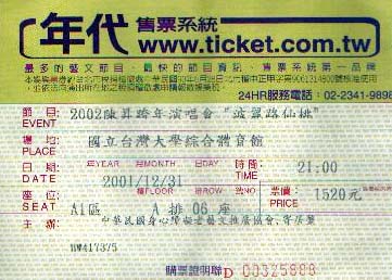 チケットは1500NTと1300NTの2種類。かなり高めだと思います。ましてや12月31日は台湾各地でオールスター総出演の無料コンサートが開かれるのですから、(台北地区だけでも5ヶ所で行われたらしい・・・)そんな中でピンで有料コンサートを開く度胸はスゴイと思います。うんうん!