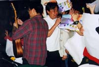 はじめは、野外のコンサートかと思っていたのですが、98年に新しくできた温泉リゾートホテル「知本富野国際渡暇飯店」にあるディスコPUBでのコンサートということで、入場料は800元。かなり高め。 当日、台湾は丁度、清明節の連休にあたり、知本にも車があふれていた。 ホテルの外には「今日は陳昇のコンサートがあります」という内容の垂れ幕や、ポスターが貼ってある。 夕食をとっていた関係で、少し遅れて入ったために前の方の席はもう埋まっていた。ステージ真横の席に座る。スピーカーよりも前なので、音はチャンと聞こえるのかしら・・? 9時開演となっていたが、始まったのは9時45分頃だった。 知らない曲でした。台湾の人は知ってるのかな? 阿VONが指揮者のように前にたつ。阿VONは三宅イッセイのプリーツみたいな服を着てるんだけど(この服は年末の新舞台でも着ていました)なぜか腰にはおきまりの手ぬぐいがぶら下がってる。かっこいいんだか悪いんだか。 陳昇は黒っぽいシャツに、膝丈パンツに素足に運動靴。 *********バンド********** バンドは、最近の不動のメンバー。 ギターは陳傑漢(小傑)、銀行に勤める傍ら陳昇のステージに参加しているハンサムなお兄さん李國禎、ベースは今回も金髪だった趙家駒、キーボードは年末の新舞台から参加している体格のいい学生さん(には見えないけど)周恆毅、総統選挙では阿扁陣営のキーボード奏者だったとか、阿扁の物まねが上手でした。 中盤「風箏」では場内を隅々までねり歩いて、後ろの方のお客さんともコミュニケートしてました。後ろの方でかたまってみていた、女の子とは抱き合ったりして。 曲の順番などはほとんどおぼえていませんで、今回はそういうレポートにはならないんですけど、特筆すべき事がいくつかあったので、順不同に思いつくままあげたいと思います。 ショウの構成は2部でした。1部が終わって、バンドが去ると、暫らくディスコになってました。 ○原住民の女の子たち○ その女の子たちに陳昇もはいって、手をつないで飛びはねてた。音楽はどんどん速くなり、ステップが大変になる。若い女の子に混じって陳昇もとっても楽しそう。 ○ダンスフロア○ 「多情兄」だったか、新寶島康楽隊の曲にあわせて、陳昇がある女の子の手をとり一緒に踊り始める(こんどのは西洋風のあれですね) ワンコーラス終わって、陳昇はステージに戻ったけど、いきなりお客さんからのダンスの飛び入りもあった。いきなり、カラオケクラブの雰囲気に・・・。この飛び入りには陳昇もびっくり、終わったら拍手を送っていた。 その後も、陳昇は何人もの女の子を誘っては一緒に踊ってた。 中盤になると、バンドのメンバーが次々にステージに座り始め、歌ってる陳昇や阿VONは立ってるんだけど、めいめいに煙草を吸いながら、床に腰掛けて演奏、なんだかとってもくつろいでる。 伴奏は「把悲傷・・」をひいてるのにいつまでも「風筝」を歌ってたり、「新楽園」では小伍までもが歌詞を忘れ、途中から演奏だけになるし・・。ソロの長まわしも、打ち合わせてあったというよりは、その場のノリって感じ。 「世界中見まわしても、自分達みたいに、ライブ中に練習できるバンドは、ないだろう」といって威張ったとか・・・。 ○物まね大会○ 機嫌がいいというのか、ふざけてるというのか? この日、陳昇はかなりハイテンションで、ニコニコニコニコして、客席に向かって手を振り「謝謝!謝謝!」を繰り返す。会場は大受け、何かと思ったら選挙の時の阿扁の物まねだった。 キーボードの周恆毅は阿扁の演説のまねをしていた。(これはよく似てたのでわかった)陳昇と何かやり取りをしていたけど、その会話は聞き取れず。(MCもすっごく多かったのだけど、ほとんどわかりませんでした。毎度の事ながらくやしい・・) 「あ!伍佰の『上帝救救我』だ!」と誰かが言う。 後半、かなり壊れかけてきた昇にいさん。 ビール瓶を片手にギターを抱える。と、いきなりビールの瓶で、ネックを押さえて、弾き始めた。あ、伍佰がよくやるやつね。でも、曲になってないよ! 客席は受けてる。マイクスタンドにギターをこすりつける、モニターにも、そして終いには、床にこすり付けてました。 「以上、伍佰のまね。あいつ、いつもこんな事やってるだろ?」 「周華健も歌詞をよく忘れるから! 」 でも、周華健のまねはやりませんでした。 禁酒・禁煙・禁ビンロウだった「新舞台」と違ってPUBでのライブだから、酒はのみ放題。 陳昇は自分の分だといって、タイガービールをケースでステージに持ち込んでいた。後半、「飲みたい人は持って行っていいよ」と客席に振る舞ってくれた。 陳昇は客席から差し入れられたテキーラとかも飲んでたなあ。ぽんってやるやつ。 ○トイレで○ ※写真はトイレ前のものではありません。客席の各地でもサイン攻め。 *********終演********** 「3分休憩」 アンコールに出て来た陳昇は、手に薔薇の花束を持っていた。歌の準備を