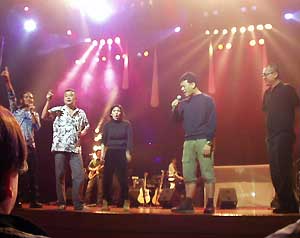 びーに舞台から蹴落とされていましたが(笑) 阿VONが一人でギター もってうたった「ナルワンの歌(?)」会場 のみんな歌えていて、私達日本人だけぽか〜んとするしかなく残念。 ゲストは、手下の「プチ ナース」の他、阿ゆぃーしかいなかったけど その分、身内で固めた感じで、まとまりもよく楽しかったです。ビーサンももらったし。初めてボビーとはぐはぐしたし(キャー)。」 |