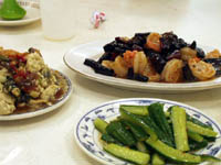 ピータン豆腐、宮保鶏丁、キュウリの冷盤?