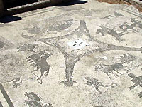 オスティアアンティカ遺跡はモザイクがいっぱい残っていてすばらしかった。ここは兵営のお風呂場かな?中央に水はけの穴があいています。 |